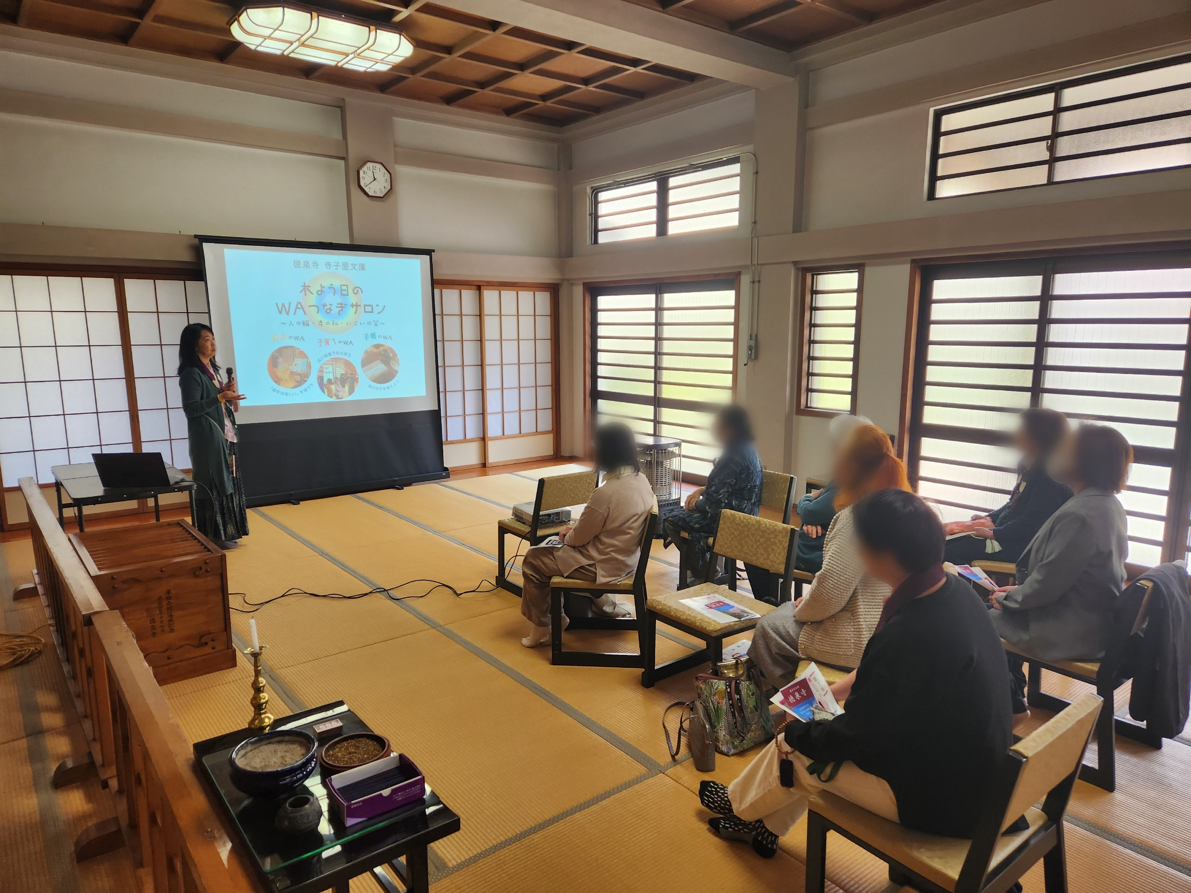 本堂で一緒に勤行(ごんぎょう)した後で、住職夫妻から「となりのお寺」と題して徳泉寺の紹介をさせてもらいました。